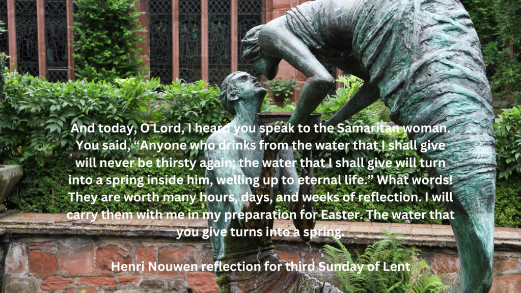 “Therefore, I do not have to be stingy with your gift, O Lord. I can freely let the water come from my center and let anyone who desires drink from it. Perhaps I will even see this spring in myself when others come to it to quench their thirst.”